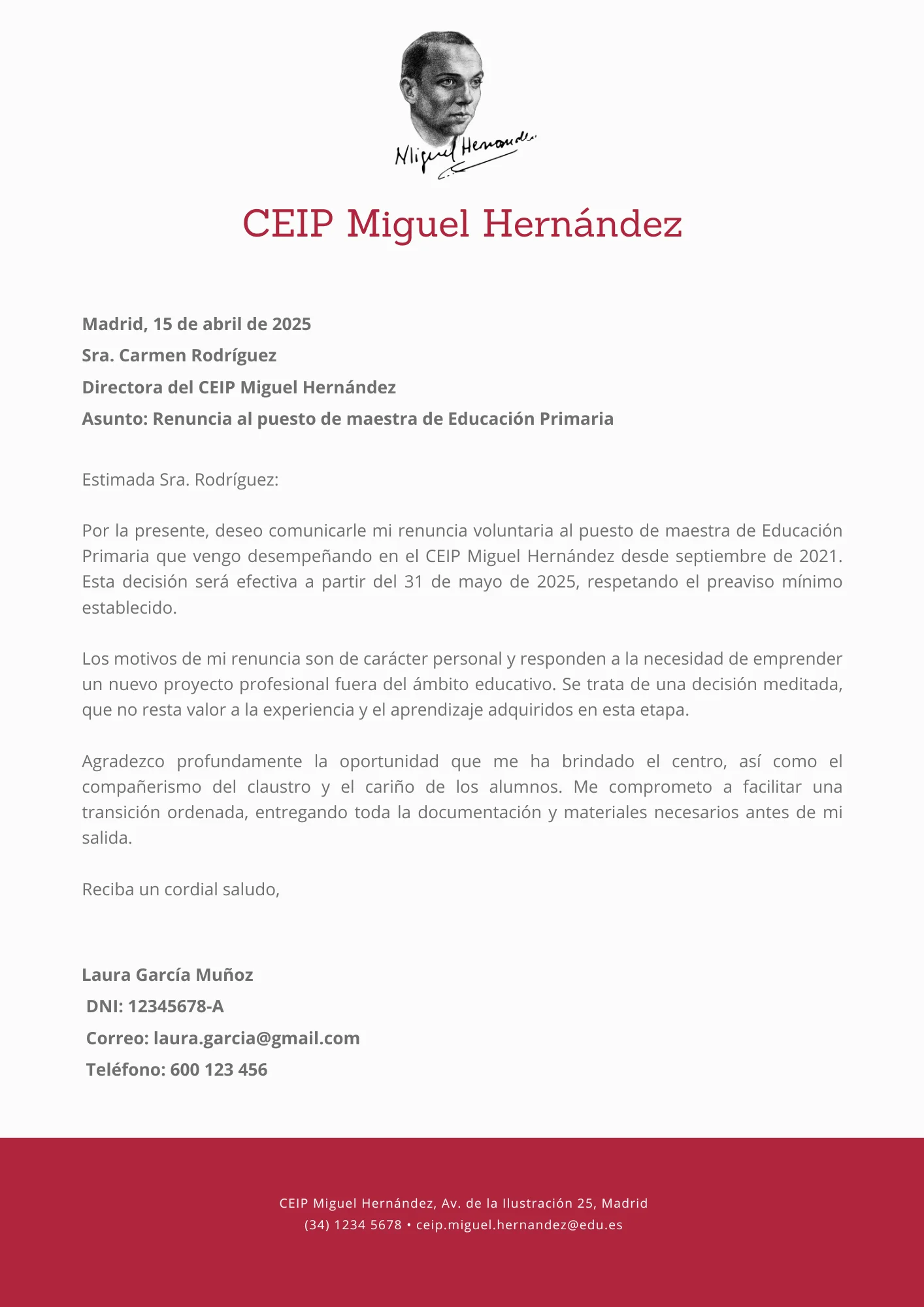 Lo más recomendable es que lo hagas de forma escrita, mediante una carta de renuncia laboral, que entregues personalmente o por correo electrónico al director o al responsable de recursos humanos de la institución educativa.